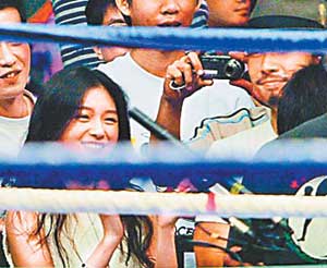當(dāng)晚,與大S一起的還有黑人、范瑋琪等。大S和吳建豪坐隔壁,大S不時鼓掌叫好,并高舉雙手加油,吳建豪則拿相機(jī)拍照,還看得瞠目結(jié)舌。比賽結(jié)束,大S趴在擂臺邊,望著臺上的壯漢,要吳建豪幫她和猛男合照,2人和拳手握手后,才心滿意足并肩離去。