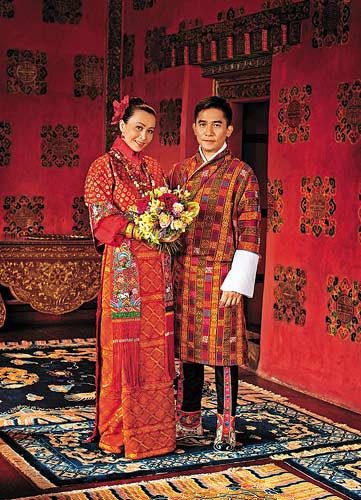 “偉玲”在不丹結(jié)婚成為當(dāng)?shù)匾患⑹,不丹王室更特別打破慣例,提供皇宮的寢室給新人拍婚紗照,并由不丹皇叔夫婦(即將登基國王之叔)親自為這對(duì)新人著裝,據(jù)了解,偉仔的禮服正是當(dāng)年皇叔結(jié)婚所穿的禮服,而嘉玲所穿的禮服則是王妃他們?yōu)槟陜H兩歲的女兒日后出嫁所準(zhǔn)備的嫁衣。
