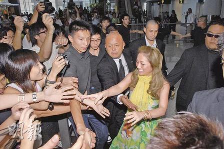 據(jù)香港《明報(bào)》報(bào)道,濱崎步昨午1時(shí)30分自日本抵港,一身古銅色皮膚的她穿著低胸綠色長(zhǎng)裙,圍著黃色絲巾,見(jiàn)到半百歌迷迎接心情大好。香港唱片公司聘請(qǐng)30名保安護(hù)送,她本身日本貼身保安亦有6、7名。