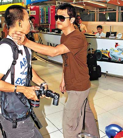 香港媒體今日報道,李亞鵬與太太王菲、大女兒竇靖童和兩歲兔唇幼女李嫣前日從不丹飛往泰國,抵曼谷機場時,由于李亞鵬不滿一名《忽然1周》男攝影記者近距拍攝李嫣,突然大發(fā)雷霆打該男攝記、一名《忽周》女記者和一名《明報周刊》男記者!逗鲋堋酚浾邎蠓Q受傷,在當(dāng)?shù)貓缶笾砩侠顏嗼i由王菲經(jīng)理人陳家瑛陪同到曼谷機場警局協(xié)助調(diào)查。