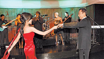 前晚曾馨瑩換上第2套紅色禮服,現(xiàn)場有樂隊、黑人歌手演唱,曾馨瑩親友團力拱新人共舞,郭臺銘一度因害羞及疲累婉拒,但禁不起全場起哄,他牽起曾馨瑩的手到舞池中跳舞,歌手機靈再獻唱抒情歌,讓兩人貼身跳慢舞。
