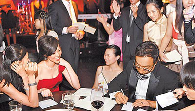 幫忙拍照的攝影師問郭臺銘:“要不要休息一下?”還建議一大群人拍合照,不要單獨拍,但郭臺銘婉拒,還是一一與賓客拍照,給足曾馨瑩面子,賓客拿出邀請卡請郭臺銘簽名,他來者不拒,現(xiàn)場宛若簽名會,由于燈光昏暗,飯店服務(wù)生還拿小手電筒幫他照明。他戴上老花眼鏡簽名,還細心寫上祝福話,老公如此貼心,曾馨瑩心疼又開心,臉上始終掛著笑。