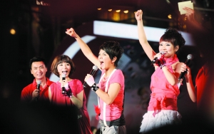 前日是北京奧運開賽首日,陳燮霞和龐偉分別在女子舉重48公斤級和男子十米氣手槍決賽中奪得金牌。為此,可口可樂昨晚在世貿天街廣場舉行慶祝中國首日奪金的儀式,成龍、S.H.E都出席并與市民一起分享了喜悅心情。當大屏幕上回放陳燮霞奪金的瞬間時,S.H.E三人忍不住在臺上歡呼雀躍。可能是心情太過激動,三人現場演唱第一曲《中國話》時,竟然有點走調。