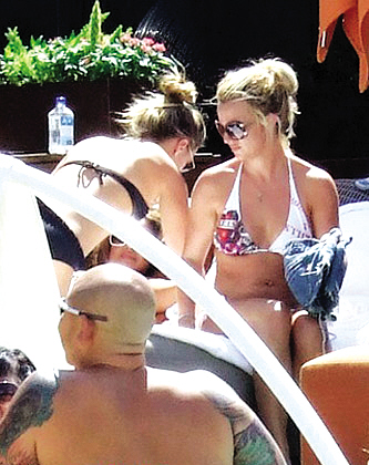 上周日,布蘭妮亮相度假村內(nèi)的游泳池邊,享受周末午后時(shí)光。身穿性感比基尼的她依舊是粗腰肥臀,身材無改善,兩位身材健碩的保鏢如影隨形地保護(hù)她的安全。