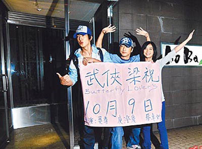中新網(wǎng)9月4日電 蔡卓妍(阿Sa)抵臺(tái)兩天,記者目擊吳尊連續(xù)兩天當(dāng)“陪吃郎”,關(guān)系曖昧。前晚拍拖再被目擊,兩人索性把約會(huì)現(xiàn)場(chǎng)當(dāng)新片《武俠梁!罚▋(nèi)地名《劍蝶》)發(fā)表會(huì),同劇演出的庾澄慶(哈林)還拿著牌子猛插嘴,十分搞笑。
