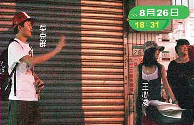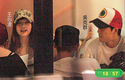 吳克群和提著大包小包的助理上車,之后又接了公司同事,三人一同來到八德路四段一間錄音室。十分鐘后,戴著白色棒球帽、個頭嬌小的王心凌,忽然出現(xiàn)在錄音室門口,悄悄進(jìn)門。在錄音室待到晚上六點半,吳克群和王心凌先后走出來,在門口先和同事道別,接著兩人和助理一同坐上吳克群的休旅車,驅(qū)車前往慶城街的一家餐廳。