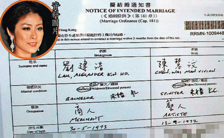 中新網(wǎng)9月17日電 香港媒體報(bào)道,陳慧琳(Kelly)和未婚夫劉建浩(Alex)拍拖16年,終于結(jié)束愛(ài)情長(zhǎng)跑,兩人將于下月2日拉埋天窗,并于洲際酒店筵開(kāi)55席宴請(qǐng)親朋。昨日在金鐘婚姻登記事務(wù)及紀(jì)錄辦事處,張貼了Kelly和Alex的擬結(jié)婚通知書(shū),當(dāng)中寫(xiě)上Kelly的真名“陳慧汶”及她身份證原用的英文名“Vivian”,而原來(lái)Alex的英文全名是“Alexander”,不過(guò)多年來(lái)外界已習(xí)慣簡(jiǎn)稱他做“Alex”。通知書(shū)上也列出Kelly和Alex的出生日期,Kelly是72年9月,而Alex則是73年5月,Alex比Kelly差不多小一年。