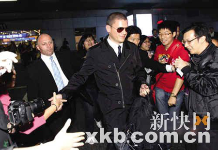 米勒穿著一件黑色的短風(fēng)衣,內(nèi)里白色的翻領(lǐng)T恤隨意地敞著領(lǐng)口,戴著黑色的墨鏡,然后帶著他標(biāo)志般的笑容,在四名皇家級保鏢的護(hù)衛(wèi)下,走入了洶涌的人群。和一般明星不同的是,米勒還自己拿著手提行李——一個(gè)Victorinox 公文包和手提箱。他一手拖著行李,一手很隨意地插在風(fēng)衣口袋里?匆姾芏鄟斫訖C(jī)的粉絲,米帥心情大悅,一邊和影迷打招呼,一邊揮手并擺起Pose讓記者拍照。此時(shí),周圍此起彼伏地響起“邁克”和“Welcome”的呼喊聲,米勒也回應(yīng):“Hi,Takecare,ThankYou!”雖然身邊圍著十幾名保鏢和工作人員,米勒還是盡可能地主動(dòng)和粉絲握手并為他們簽名,態(tài)度非常友善,絲毫沒有大牌明星的架子。
