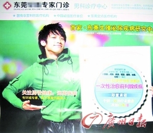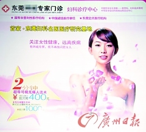 明星拍廣告是常事,但廣告天天有,東莞特別多。一不小心,劉德華成了東莞某診所前列腺廣告的“代言人”,清純美女林志玲也笑靨如花地“代言”某診所無痛人流廣告,而容祖兒也著裝性感地成為某診所廣告的封面女郎……