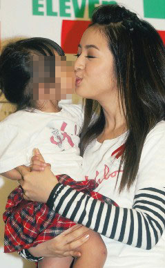 林依晨(右)昨天為關愛之家募款,親吻艾滋寶寶,希望大家別歧視艾滋病患。