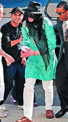 日前,被指患上怪病的邁克爾·杰克遜以極為騎呢與驚嚇的“佐羅”造型外出,不過邁克爾·杰克遜除了眼罩與帽子外,他的其它裝扮卻跟佐羅相差甚遠——沒有戴披風,還穿著一雙拖鞋。