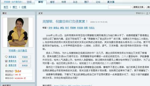 宋祖德在博客里面寫道,他是從自己下屬某公司獲得該內(nèi)幕的,除了知道他們是在炒作外,還獲悉倪震已經(jīng)負(fù)債500萬港幣。并炮轟倪震借鑒“伊能靜與庾澄慶婚變事件”策劃出這一起分手復(fù)合戲,其意是在保持周慧敏的關(guān)注度,以便提高周慧敏的演唱會(huì)票房牟利。田雯