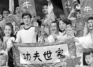 一部《李小龍傳奇》讓陳國(guó)坤成為2008年人氣最旺的演員之一,由他參演的滑稽舞蹈《功夫世家》也是昨天彩排中人氣最高的節(jié)目,雖然以李小龍裝扮出現(xiàn)的陳國(guó)坤表演“雙截棍”的時(shí)候,觀眾席上前排一位一直在玩游戲機(jī)的小男孩也看得拍起手來(lái)。《功夫世家》的風(fēng)格相當(dāng)搞笑,演員們有的穿著睡衣,拿著飯鍋、菜板等道具,在一起“比武”。節(jié)目里面的人物很多“借鑒”自周星馳的電影作品,造型怪異,但卻個(gè)個(gè)功夫高強(qiáng),甚至《功夫》里的戴著“燙發(fā)卷”的“包租婆”也出場(chǎng)“搞笑”了。陳國(guó)坤在《功夫世家》中最后亮相,他除了表演雙截棍外,還要用拳和腿分別擊開(kāi)兩塊木板。雖然是以舞蹈節(jié)目的形式出現(xiàn),《功夫世家》在現(xiàn)場(chǎng)贏得的笑聲并不比演員類(lèi)節(jié)目少。