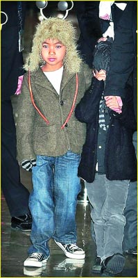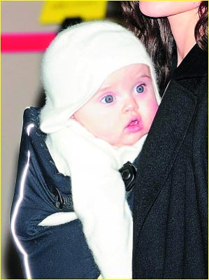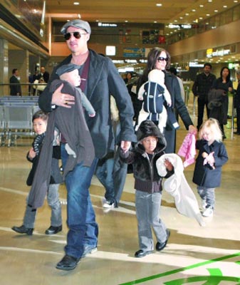 皮特和茱莉帶著6名子女到東京,分別宣傳兩人的新片《本杰明·巴頓奇事》和《換子疑云》,全家在機(jī)場(chǎng)獲禮遇快速完成通關(guān)。皮特胸前抱著諾克斯,左手牽著非洲裔養(yǎng)女扎哈拉,右手拉著越南養(yǎng)子帕克斯,率先入境,現(xiàn)場(chǎng)200多名“粉絲”瞬間陷入瘋狂,尖叫聲不斷。茱莉則是懷抱維維恩,牽著希洛與馬多克斯緊跟在后,她頻向左方護(hù)欄后的“粉絲”微笑致意,希洛看了有樣學(xué)樣,也轉(zhuǎn)身好奇地觀望群眾。馬多克斯與扎哈拉顯得心不在焉,倒是排行老二的帕克斯,似乎還不太習(xí)慣鏡頭與人群,他最后一個(gè)下飛機(jī),入境時(shí)頻頻舉手遮眼,甚至以衣服包頭閃避鎂光燈。