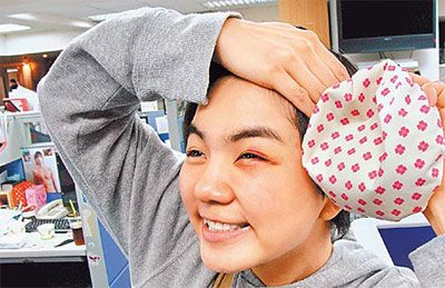 中新網(wǎng)2月3日電 大年初五時(shí)S.H.E.團(tuán)員Ella與友人到墾丁沖浪,不料卻衰運(yùn)連連,先被沖浪板打到頭及腰部,最后翻落海水中時(shí),竟被浪板砸到左眼眼窩處,當(dāng)場瘀青及浮腫,走回岸邊時(shí)腳又被海膽利刺、石頭割傷,屬雞的她忍不住大叫:“不是聽說屬雞的今年很旺嗎?怎會(huì)這樣?”她昨還自嘲:“快來看貓熊,不用排隊(duì)喔!”