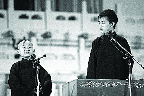 昨晚演出前大會(huì)堂門(mén)口的黃牛黨多數(shù)都在收票,演出開(kāi)場(chǎng)后原價(jià)票依然還有人肯買(mǎi)。演出舞臺(tái)裝飾成天壇的樣子,讓北京觀眾感到相當(dāng)親切。郭德綱兒子郭麒麟和義子陶陽(yáng)開(kāi)場(chǎng)就說(shuō)了《學(xué)雜唱》,這個(gè)段子主要表現(xiàn)演員對(duì)各種戲曲唱段掌握程度,比相聲臺(tái)高一點(diǎn)點(diǎn)的郭麒麟不僅將梅葆玖、袁世海等名角唱腔模仿得很像,而且現(xiàn)場(chǎng)還唱起了流行歌曲,此外口才也相當(dāng)了得,不少觀眾感嘆“還是有郭德綱的遺傳基因,天賦不俗。”