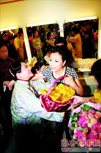 昨日下午2時許,位于無線電視城內的記者會現場喜氣洋洋,紅綢和鮮花把“恭賀汪明荃結婚之喜”的嫁女儀式裝扮得異常溫馨。伴隨著羅家英先行錄好的搞笑旁白:“講到女人,唉,都完全沒有感覺!但提起下面這一位,我個心就甜曬!卑⒔闾鹦χ≈噩F身。