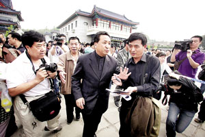 9點(diǎn)10分左右,常寶華、劉惠等人紛紛從側(cè)門離開(kāi),被群眾和媒體以包夾之勢(shì)分別圍住。