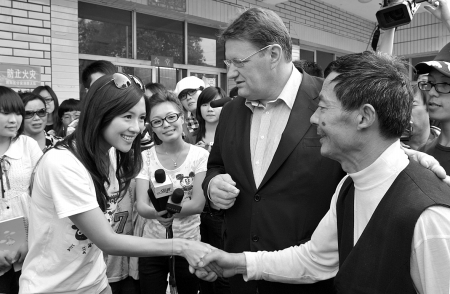 在探望中,一位大爺來到章子怡身邊。院長吳德玉向章子怡介紹,這是福利院的門衛(wèi)大爺。在去年5·12地震發(fā)生時,為了救被困在院里的孩子,大爺不顧危險翻墻進去,不慎摔傷了自己的雙腿。章子怡很感動,她突然伸出右手高呼:“向抗震英雄學習!”并佩服地對大爺說:“你是英雄,你是超人!”