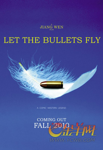 繼《花木蘭》、《狼災(zāi)記》等大片相繼出擊后, 姜文的新片海報(bào)也在戛納亮相。這幅畫面簡(jiǎn)潔卻極具沖擊力的海報(bào),因?yàn)槭侨⑽亩恢北恢袊?guó)記者“忽略”,但就吸引了眾多海外片商駐足。海報(bào)主色調(diào)為飽滿的藍(lán)色,畫面的主體是一顆飛行的子彈和一根飄動(dòng)的潔白羽毛,子彈下方的三個(gè)簡(jiǎn)單英文單詞則點(diǎn)出了三大商業(yè)元素:喜劇、西部、傳奇,英文片名為《Let the bullets fly》(直譯:讓子彈飛吧)———這些都透露出該片會(huì)是一部與姜文此前作品完全不同的商業(yè)大片。