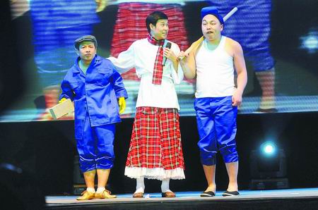 晚9時(shí)40分許,全場響起最熱烈的掌聲和叫好聲,“小沈陽!陽仔出來了”的叫喊聲此起彼伏。這次小沈陽雖然還是一身蘇格蘭裝扮,但頭上沒有發(fā)卡,手上的女士花包幾乎沒上過肩,聲音也變得陽剛起來,只在調(diào)節(jié)氣氛時(shí)偶爾用一下他擅長的“嚎”音,儼然有轉(zhuǎn)型的味道。接下來的約40分鐘,不管是中國足球的笑話、還是翻唱《大海》等,場面上熱鬧非常,但關(guān)注小沈陽的人會發(fā)現(xiàn),這些東西他已經(jīng)演過很多遍了!