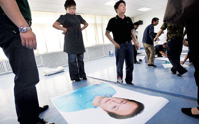 上午10時(shí)許,大廳入口處已經(jīng)擺開一排長桌,工作人員正對(duì)著筆記本挑選羅京的相片,仔細(xì)確認(rèn)相片的尺寸后,交代人員去打印以備布置靈堂之用。