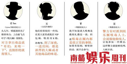 一個手底下帶著以曲藝形式包裝的Live樂隊(duì)的經(jīng)紀(jì)人老Tan對本報(bào)記者透露,自己也曾遇到過這種情況,對方拿出毒品說“哥們,來吸一下”,這個時(shí)候,如果你不夠圓滑,直接拒絕就可能得罪對方。“如果我走進(jìn)包房,聞到有什么異樣的味道,我就會待一會兒,趕緊走。如果真躲不過被對方問到,我也會找個理由,比如上廁所或者其他什么的,溜掉。肯定不能讓對方覺得我不把他當(dāng)哥們。當(dāng)然,這也是一時(shí)之計(jì),時(shí)間長了,人家也知道你不好這口,干脆就不帶你玩兒了! 也有某經(jīng)紀(jì)人W說:“我不知道請人吸毒是最高禮遇這一說,但是吸毒在圈內(nèi)都是很正常的事情。如果有原則,夠堅(jiān)持的話,就不會參與。我看見有人吸,也會勸勸對方別沾這個。不過圈內(nèi)最正常的玩法還是喝酒和泡妞。”