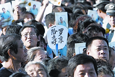 清晨開(kāi)始,來(lái)自各方的群眾自發(fā)前往八寶山悼念羅京,長(zhǎng)達(dá)百米的隊(duì)伍蜿蜒而至公墓大門之外,數(shù)百只花圈擺滿靈堂兩側(cè),寄托著各方人士對(duì)羅京的緬懷之情。有白發(fā)蒼蒼步履蹣跚的80歲老人,有在父母帶領(lǐng)下、牙牙學(xué)語(yǔ)的孩子,有從小與羅京一起學(xué)習(xí)的同學(xué),有羅京高中母校的代表,有曾經(jīng)受過(guò)他指導(dǎo)的實(shí)習(xí)生,還有專程從美國(guó)趕來(lái)送羅京最后一程的校友,很多人憶起與羅京生前的點(diǎn)滴黯然淚下。近萬(wàn)人的哀悼隊(duì)伍井然有序,大家手持白菊,每七人一組向羅京遺體三鞠躬,為“國(guó)嘴”祈禱送行。
