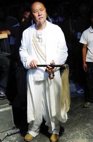 造型:一身白袍,加上白頭發(fā)白胡子,再掛一串菩提子,這個(gè)意境十足的裝扮只需花五分鐘———此乃現(xiàn)場(chǎng)記者親自驗(yàn)證。劉鎮(zhèn)偉為人寬容,記者湊著他猛拍也不介意,還叫化妝師把簾子拉開,別把大家熱壞了。