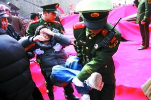 開機(jī)大典在一片鑼鼓和禮炮聲中拉開序幕。當(dāng)?shù)氐臄?shù)千名圍觀群眾剛開始還秩序井然,多數(shù)在遠(yuǎn)處旁觀。但是,隨著眾主創(chuàng)的陸續(xù)登臺(tái)亮相,人群中開始騷動(dòng)起來。盡管現(xiàn)場(chǎng)有人數(shù)頗多的保安維持秩序,但是都保護(hù)著明星和領(lǐng)導(dǎo),并沒有安排專人負(fù)責(zé)媒體席,令300多位群眾瞬間涌上原本只能容納百人的一米多高的簡(jiǎn)易媒體臺(tái)。
