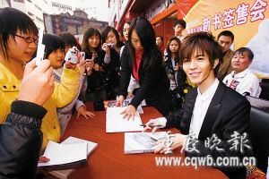 簽售開始,氣氛更加火爆。走到簽名桌前的粉絲激動不已,排到后面的則一臉焦急。一位粉絲貼心地告訴郭敬明“下次不要遲到了”,另一位粉絲直接向郭敬明表白“我愛你”,說完后緊張地拍了拍胸口,舒了口氣。郭敬明很有經(jīng)驗,一點不驚慌,微笑著說了聲謝謝。之后他接受記者采訪時表示:“重慶的女孩確實比較火辣。”