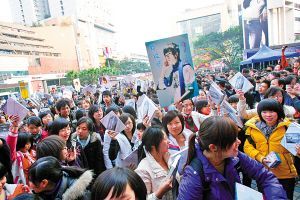 從早上8點開始,沙坪壩重慶書城前就開始有郭敬明的粉絲前來。一位15歲的女孩告訴記者,她是早上9點鐘到的,中途吃飯時花10塊錢雇了個棒棒幫忙排隊,其余時間都站在這里。女孩的媽媽也陪同前來,但比女兒害羞,不愿意接受采訪,不停地擋住自己的臉讓記者不要拍她。女兒卻很踴躍:“我們?nèi)叶际切∷牡姆劢z,但我爸爸覺得男娃兒來不好,才沒有來!倍F(xiàn)場大多數(shù)都是十幾歲的女孩,記者4點半到達時已經(jīng)聚集了近千人,把沙坪壩重慶書城門口圍得水泄不通。