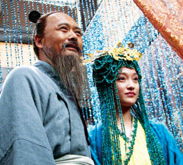 宮殿內(nèi),周潤(rùn)發(fā)扮演的長(zhǎng)須孔子跪在殿中,身著藍(lán)色華服、頭頂金色鳳冠、腳踏超高木屐、手執(zhí)羽毛蒲扇的“南子”周迅滿臉含笑,繞場(chǎng)一周端詳孔子,然后一膝跪下,口中念念有詞:“聽說夫子在魯國(guó)教書,有句‘窈窕淑女、君子好逑’,夫子可知否?”在得到肯定回答后,南子湊到孔子跟前,繼續(xù)“眉目傳情”:“不知詩三百里有多少男女之事?”“孔子”答曰:“詩三百,一言以蔽之,思無邪!