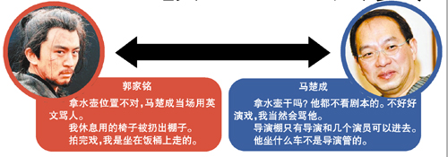 馬楚成說:“我對郭家銘是有意見。我是很少罵人的導(dǎo)演,為什么我罵了他?為什么片場的化妝、梳頭這些工作人員都不喜歡他?我覺得他應(yīng)該檢討一下自己。他的戲演得不好,我讓他演一場醉酒的戲,開拍之前他喝了很多酒,正式拍的時候他竟然醉到了沒法拍的地步,要第二天重拍。他們那邊又說第二天不行,他要去云南拍一個電視劇。我很生氣,因為他們進(jìn)組前告訴我說已經(jīng)推掉了云南那個戲,怎么能刻意騙人呢?搞得我們的戲卡在那里。再說他拿著水壺的那場戲,他都不看劇本的,大家都沒水喝了,他拿那么大壺水干嗎?自己不好好演戲,我當(dāng)然會罵他啦。我讓他演戲不要那么夸張,他不聽,當(dāng)自己大牌,那我就只好刪他的戲了。他還不斷地問我為什么不拍他的特寫,這部戲叫做《花木蘭》哦,每個群眾演員、每個小角色都給很多特寫,這戲還怎么演?”