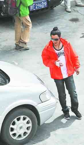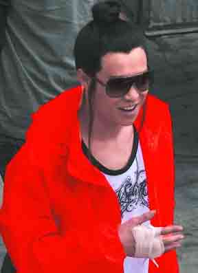 小沈陽穿著一件鮮亮的橙色外套,里面是一件隨意的白色T恤,臉上已經(jīng)化好妝,戴著墨鏡,而不是大家常見的黑框眼鏡,乍一看還真有點認不出來。小沈陽的古裝頭套已經(jīng)戴好,只是一個簡單朝上梳的發(fā)髻,不過鬢角兩側(cè)還特地留了兩縷長長的頭發(fā)。記者一眼就發(fā)現(xiàn),小沈陽的右手不自然地舉在小腹前,還用白色的紗布進行了包扎,肯定是受傷了。不過小沈陽的心情看上去好極了,他先是哼歌,后來見記者追問拍戲感受,他便取下墨鏡,反問記者是哪里人,不過面對“第一次和張導(dǎo)拍戲的感覺怎么樣”的問題,小沈陽只是微笑,并不回答。