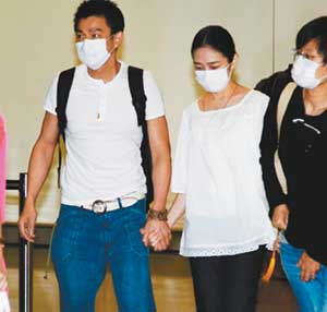 晚10時(shí)半左右,劉、朱飛抵香港,上百媒體及fans“急撲”機(jī)場(chǎng)一探究竟。當(dāng)閘口打開,遭媒體圍攻的華仔不愿松開朱麗倩的手并一起步出機(jī)場(chǎng),為保護(hù)朱麗倩不被人群撞倒,華仔更騰出另一只手摟著朱麗倩,二人寸步不離,非常恩愛。接著,華仔與朱麗倩在幾名保安及警員保護(hù)下匆匆離開,不過由于場(chǎng)面極度混亂,其間不時(shí)有人跌倒及出現(xiàn)掉鞋子的狀況。