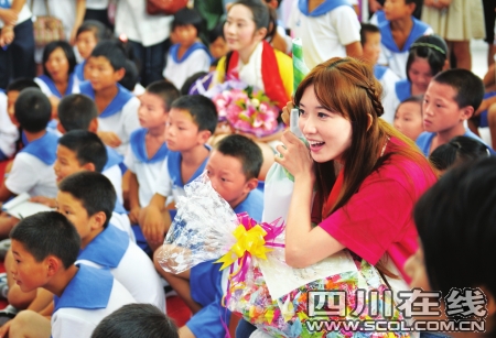 昨日上午,林志玲領(lǐng)銜,曾寶儀、光良、江美琪、許慧欣、謝娜、譚維維、胡彥斌、弦子、楊紫等走進(jìn)了嶄新的“安康家園”棠湖小學(xué),這里生活著幾百名因地震受創(chuàng)的孩子。而在校區(qū)食堂,一個(gè)簡(jiǎn)單隆重的“愛(ài)在傳遞”安康家園兒童心系臺(tái)灣小朋友活動(dòng)正在舉行,60余位小朋友看著電視上的大明星來(lái)到了他們身邊,都非常興奮,還獻(xiàn)上了潔白的哈達(dá)。