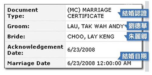臺灣《蘋果日報》28日從美國內(nèi)華達州克拉克郡的公共搜尋網(wǎng)站上,搜尋到華仔和朱麗倩的結(jié)婚登記資料,他們分別以粵語發(fā)音的英文名字Lau Tak Wah Andy(劉德華)和Choo Lay Keng(朱麗卿,朱麗倩的本名)登記,日期是2008年6月23日。