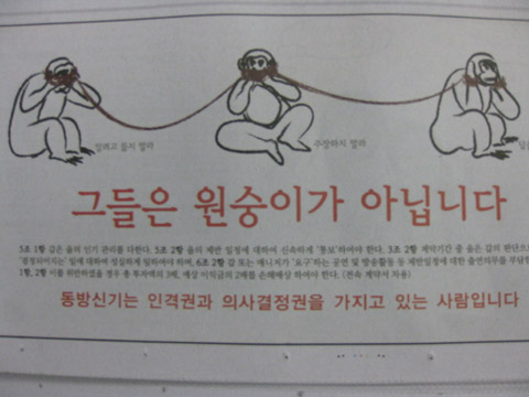 9月10日,歌迷登出的廣告援引了組合和SM間專屬合同的部分內(nèi)容,把東方神起成員比喻成被遮住口眼的猴子,諷刺了合同的不公平性。還用了(以SM的口氣)“別想知道太多”、“別提主張”和“別期待有什么答案”等廣告語進(jìn)行了尖刻的批評。