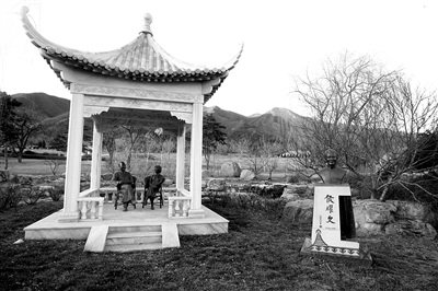 家族墓地是坐北朝南,正中間是侯寶林夫妻的墓地,有特色的是兩人的“棲息地”是在一個(gè)白色亭子里。老兩口的雕像各自“坐”在凳子上,悠閑地聊天、對望。