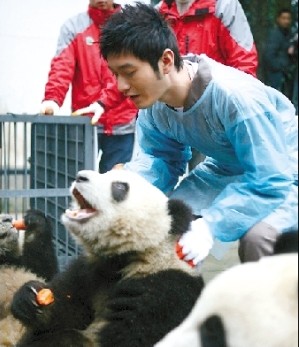 昨日,由臥龍中國保護大熊貓研究中心精心遴選的10只大熊貓,從該中心雅安碧峰峽基地啟程前往助陣上海世博。作為“中國保護大熊貓研究中心熊貓愛心大使”的黃曉明,同時又是成都和雅安的熊貓愛心大使,以及上海世博會志愿者宣傳大使,特意向劇組告假趕到雅安現(xiàn)場。此行他不僅是為了宣傳保護大熊貓和世博,最重要的是為了來替自己的一雙“兒女”送行。原來由他出資百萬元認(rèn)養(yǎng)的地震后出生的全球首對雙胞胎大熊貓“平平”、“安安”這次就將以“哥哥”、“姐姐”的身份帶領(lǐng)另外8只熊貓遠赴上海世博。(春城晚報)