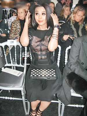 范冰冰于巴黎時(shí)間前日(3月6日)在當(dāng)?shù)匦蕾p時(shí)裝秀,穿上黑色透視裝的她,內(nèi)襯肉色三角錐體Bra(文胸),有型又新潮。