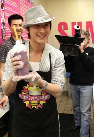 中新網(wǎng)3月25日電 因解約事件而有一段時間沒有公開露面的Super Junior中國籍成員韓庚,近日現(xiàn)身美國洛杉磯某知名奶昔店,制作以自己名字命名的奶昔產(chǎn)品“韓庚舞動奶昔”。