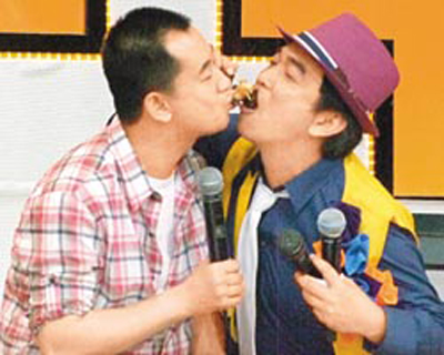前晚兩人上《我猜我猜我猜猜猜》,介紹臺(tái)灣夜市很紅的小吃“海怪級(jí)章魚腳”,吳宗憲喂黃海波吃,但怕他咬不斷,主動(dòng)用嘴巴幫忙咬,差點(diǎn)男男吻。昨晚海清錄中視《新聞6一下》,體驗(yàn)當(dāng)主播,大嘆當(dāng)主播比演戲難太多。