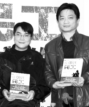 “周述恒指望《中國式民工》的稿酬回家蓋樓,主要就是看沈先生了”。央視著名主持人崔永元邊說邊把話筒遞給了外交部前新聞發(fā)言人、世界知識出版社總編輯沈國放。沈國放說,“希望大家都來關(guān)注這本書,關(guān)注農(nóng)民工!4月6日下午,四川籍民工周述恒的《中國式民工》一書的首發(fā)式在王府井書店舉行。