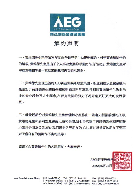 AEG新亞洲娛樂聯(lián)盟集團(tuán)的聲明指,黃維德先生已于2009 年初向華誼兄弟主動(dòng)提出解約,對于要求解除合約的請求, 黃維德先生是出于個(gè)人事業(yè)發(fā)展的考慮而作出的決定。