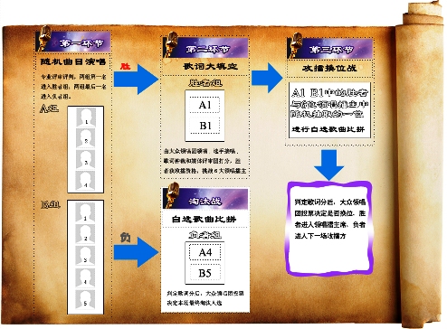 攻擂戰(zhàn)階段,攻擂方的9位攻擂者將分為兩組,首先通過幾個環(huán)節(jié)的比拼由三位專業(yè)評審決出兩組中的勝者和負者,兩位負者進入負組比拼,由大眾領(lǐng)唱團票選決定誰將被淘汰;兩位勝者進入勝者組比拼,由媒體評審團決定誰有資格攻擂,勝出的挑戰(zhàn)者可以選擇6位守擂者中的其中一位進行換位挑戰(zhàn)賽,如果挑戰(zhàn)者勝出則可以取代被挑戰(zhàn)的領(lǐng)唱進入守擂方陣營,兩者之間身份互換,最終挑戰(zhàn)成功與否將由大眾領(lǐng)唱團票選決定。