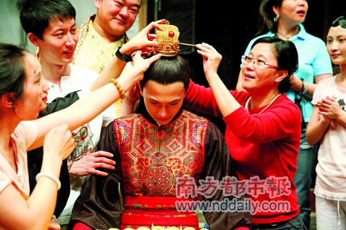 李少紅執(zhí)導(dǎo)的新版《紅樓夢(mèng)》歷經(jīng)一年三個(gè)半月的緊張拍攝,終于在昨日殺青!皩氂瘛睏钛笠苍谶@一天迎來了自己的18歲成年生日。昨日,劇組殺青之日,導(dǎo)演李少紅與近百名演職人員一起,為“成年寶玉”楊洋舉行了熱鬧的成人禮。李少紅親手為楊洋摘下通靈寶玉,象征劇組正式殺青;隨后,李少紅又為楊洋戴上金冠,取意“加冠成人”(左圖)。楊洋感動(dòng)得語(yǔ)帶哽咽:“18歲生日在劇組度過,我覺得很有意義。它對(duì)劇組的拍攝工作是一個(gè)圓滿的終點(diǎn),但對(duì)于我個(gè)人來說,卻是人生新的起點(diǎn)!