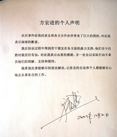 方宏進的聲明字數(shù)并不多,全文為打印字體,在文末空白處,方宏進簽上了自己的名字。一開頭,方宏進就道歉,“此次事件給我的親友和各方合作伙伴帶來了巨大的困擾,對此我表示深深的歉意。”飽受爭議的方宏進直言:“希望此事能夠盡快依法解決,讓涉及的企業(yè)和個人都能夠安心地從事各自的工作!
