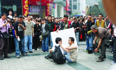 上午10點(diǎn)10分,記者趕到現(xiàn)場時(shí),解放碑下已經(jīng)聚集了數(shù)百群眾,不少人正在熱烈討論:“費(fèi)力抓到個(gè)小偷,結(jié)果是在拍戲嗦!痹瓉,昨天的戲份是扮演張國立舞蹈老師的韓雨芹正在逛街,錢包被小偷偷了,“暗戀”老師的張國立發(fā)現(xiàn)后,奮勇抓住了小偷。一位工作人員告訴記者,一開始拍攝的是遠(yuǎn)景,出場的是身著張國立同樣服裝的替身演員,為求真實(shí),攝影機(jī)和工作人員都離得比較遠(yuǎn),現(xiàn)場非常不好控制。記者看到,每當(dāng)替身演員大喊抓小偷時(shí),本該由扮演路人的演員出場一起圍抓小偷,誰知總有不少路人以為真有“小偷”,上百人一擁而上,還有的出手打“小偷”,導(dǎo)演不得不數(shù)次叫停,最后連張國立都上前來營救“小偷”。
